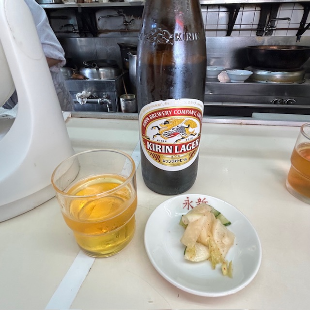 付け合わせのピリ辛おしんこがまた良い。シャキッとした歯ごたえと唐辛子の刺激が、ビールの旨さを引き立てる。