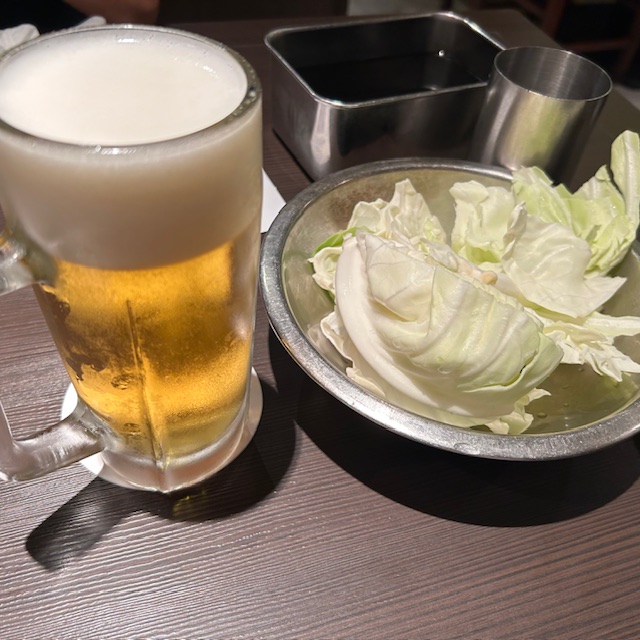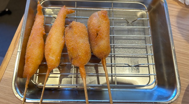 ビール、お通しのキャベツ、串カツ5本がつくお得なセット。串カツは豚、レンコン、うずら、海老、玉ねぎ。どれも揚げたてでサクサク。キャベツはおかわり自由。口直しに最適。駅構内ながら落ち着いた雰囲気で、旅の余韻に浸る時間。新幹線の待ち時間にもぴったりの店。