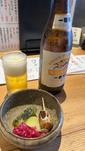 お通しは巻貝、煮凝り、セロリの漬物。酒の肴にぴったりである。