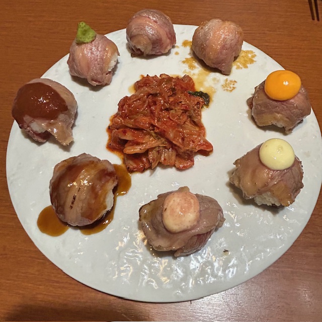 レアなカルビで巻かれた手毬寿司。見た目は華やかでSNS映えする一皿。だが、味は可もなく不可もなく。