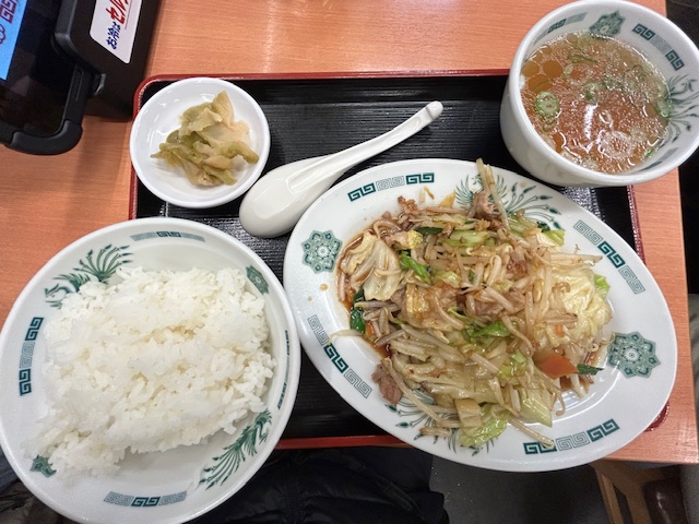提供までのスピードが早いのも日高屋の魅力。湯気を立てて登場した野菜炒めは、もやしのシャキシャキ感が際立つ一皿。キャベツの甘みがしっかり引き出され、香ばしい炒め油の香りが食欲を刺激する逸品。