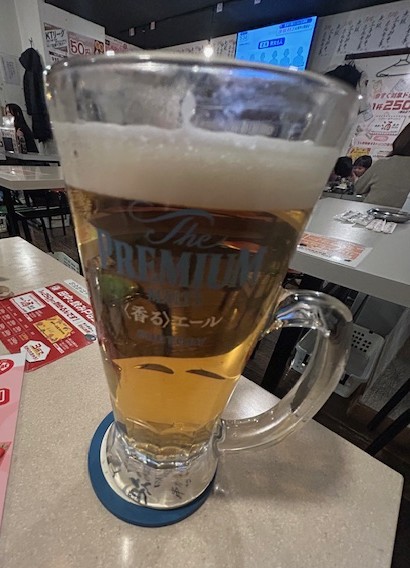 キンキンに冷えたジョッキが手に心地よい。チェーン店とはいえ、プレモルがこの価格で飲めるのは破格。喉を通る苦味と香りが一日の疲れを吹き飛ばす爽快感。