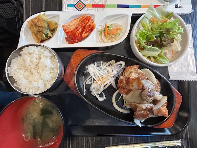 本場感のあるキムチ、香ばしいチヂミ、しっかり味のナムル、味噌汁、サラダが並ぶ豪華さ。