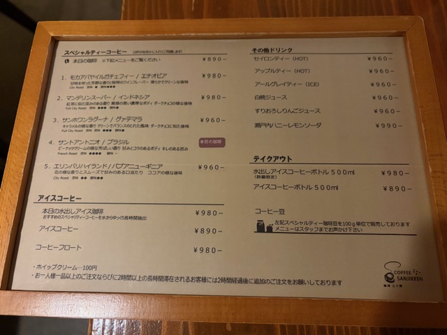 三十間は農園指定のストレートコーヒーを中心に、常時4〜5種類の豆を揃え、鮮度にこだわった一杯を提供する店。